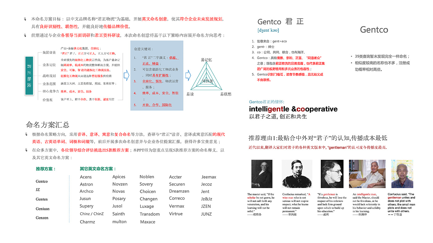 深入調(diào)研,了解到君正物流采用高端的進(jìn)口車為客戶提供了快捷可靠的物流服務(wù)。提供的“Gentco ”這一英文命名創(chuàng)意具有儒雅、親和、正直、“同道者眾"之意;既包含君正物流的品牌底蘊(yùn),也代表君正集團(tuán)廣闊的視野格局和多元業(yè)務(wù)的包容性,同時(shí)兼顧提高注冊成功率;品牌標(biāo)志設(shè)計(jì)也考慮到了君正物流國際化、正直、安全、效率等品牌個(gè)性;從而為君正物流品牌構(gòu)建了一個(gè)開放、和諧而延展性強(qiáng)的品牌家族體系。