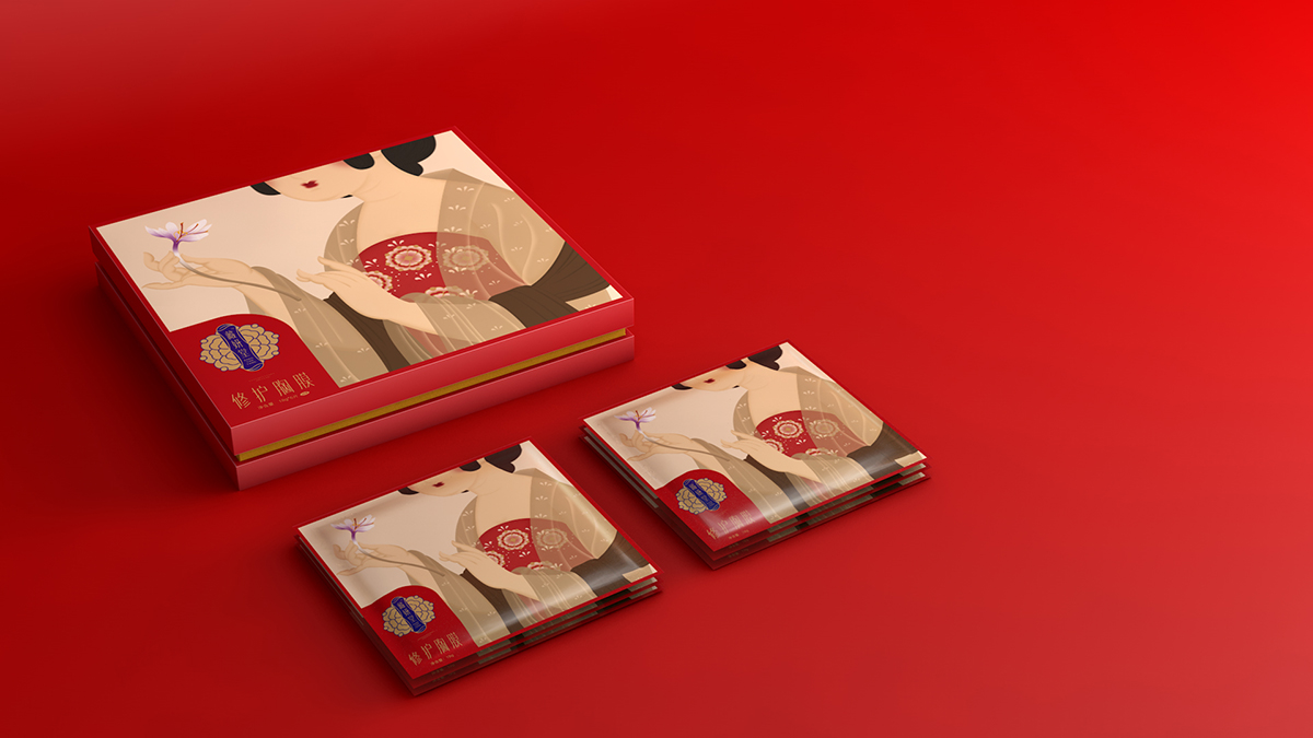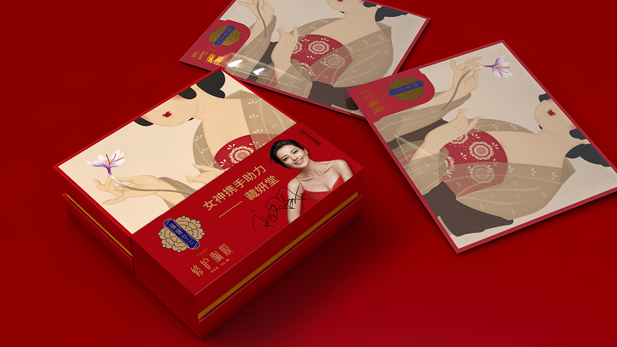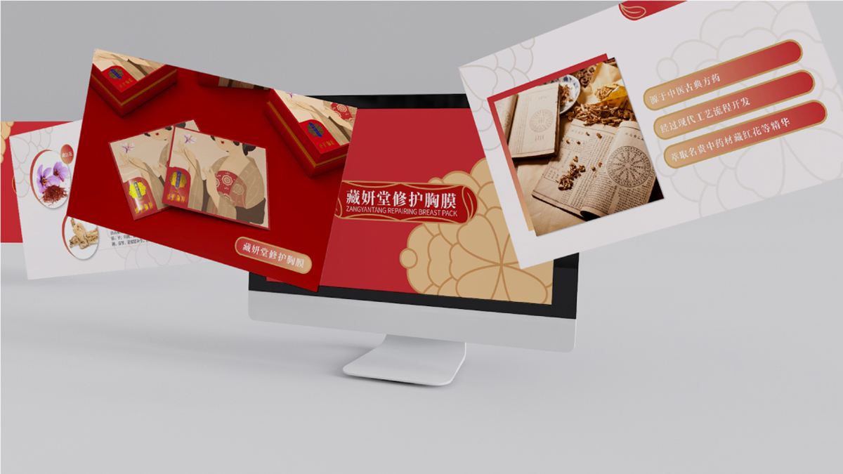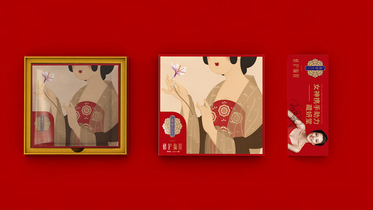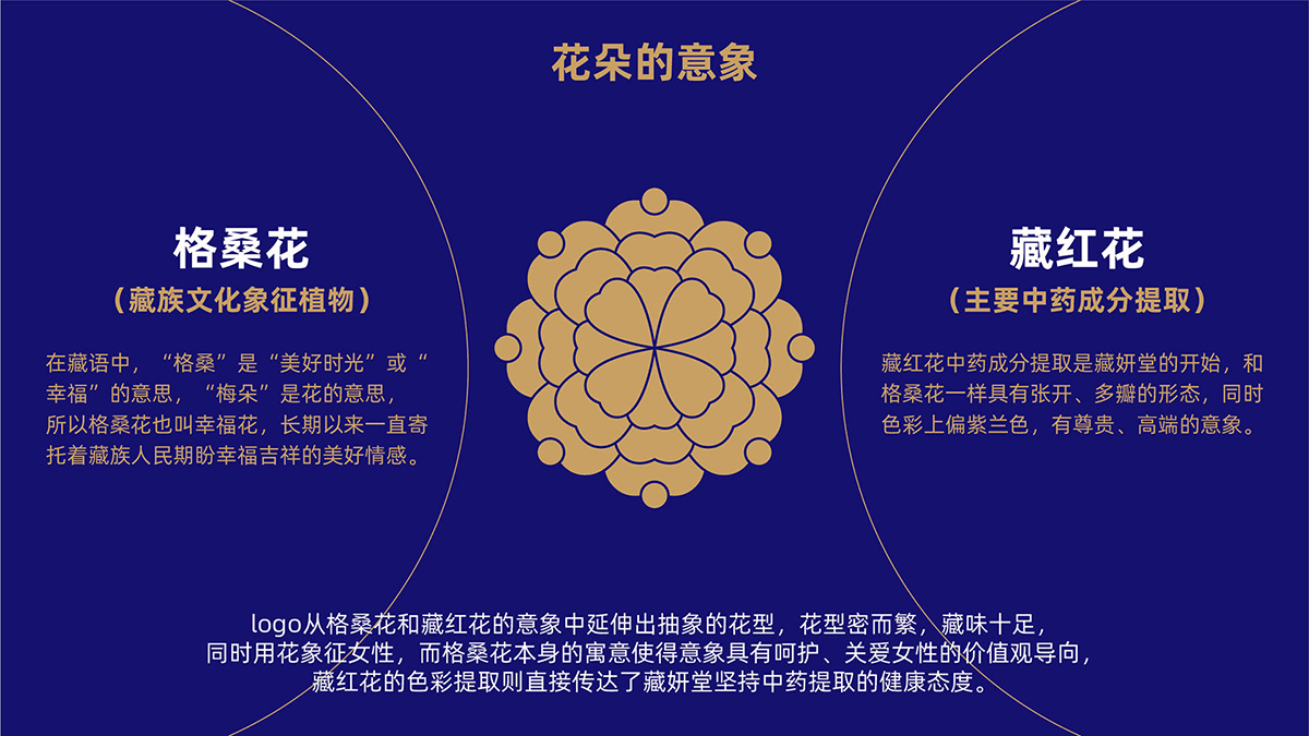 LOGO從格桑華和藏紅花的意向中延伸出抽象的花型,花型蜜而繁,藏味十足,同時(shí)用花象征女性,而格?;ū旧淼脑⒁馐沟靡庀缶哂泻亲o(hù)、關(guān)愛女性的價(jià)值觀導(dǎo)向,藏紅花的色彩提取則直接傳達(dá)了藏妍堂堅(jiān)持中藥提取的健康態(tài)度。
