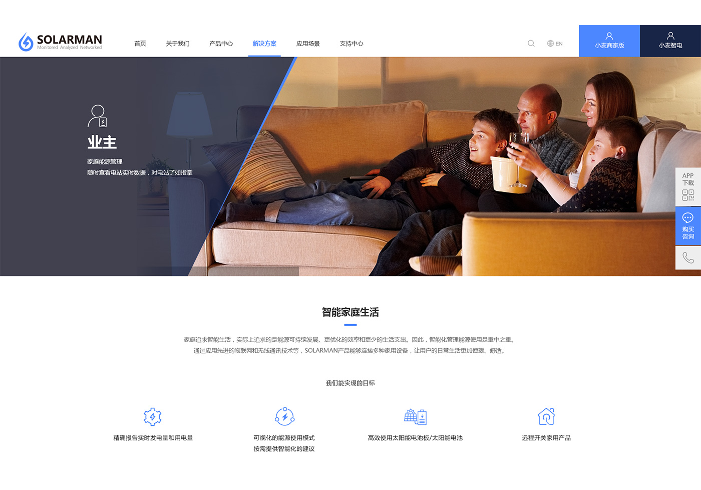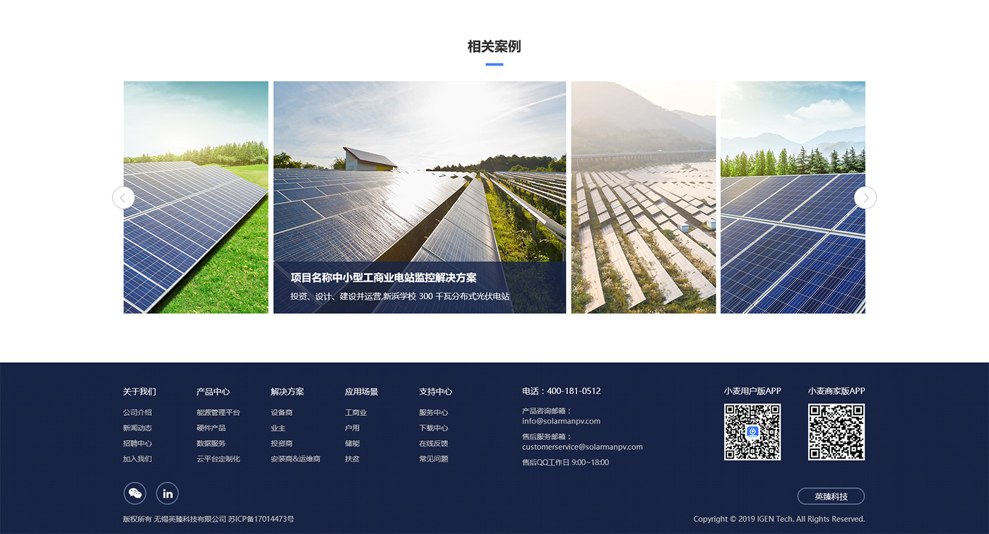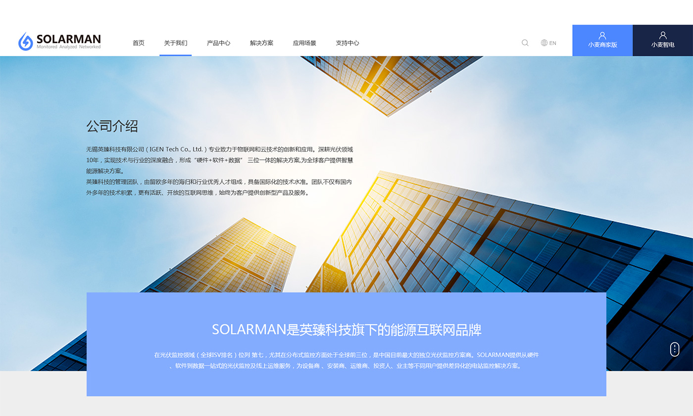 分析英臻是一家以科技能源為主的科技企業(yè),主要以太陽能發(fā)電到電能管理,網(wǎng)站整體風(fēng)格以簡潔科技環(huán)保的風(fēng)格來體現(xiàn),以藍(lán)色為主色調(diào)。網(wǎng)站通過實(shí)物圖片和虛擬二維場景來體現(xiàn)物聯(lián)的概念,使現(xiàn)實(shí)場景和智能管理相結(jié)合,網(wǎng)站統(tǒng)一的圖標(biāo)風(fēng)格使視覺效果更加精致和簡潔。