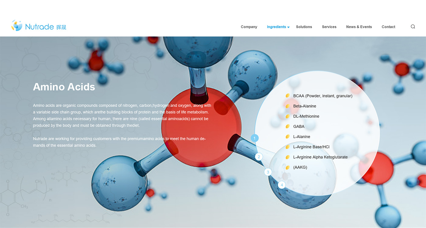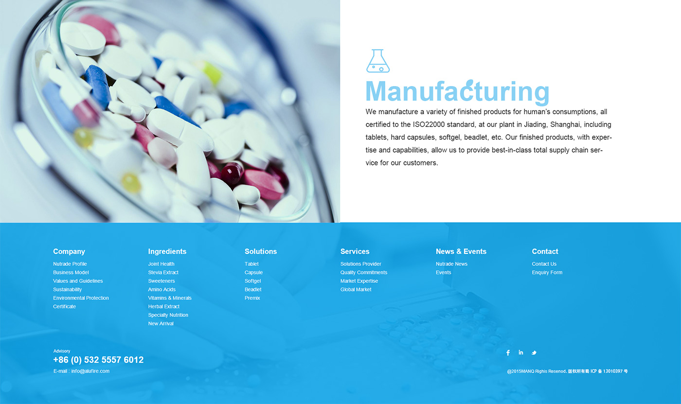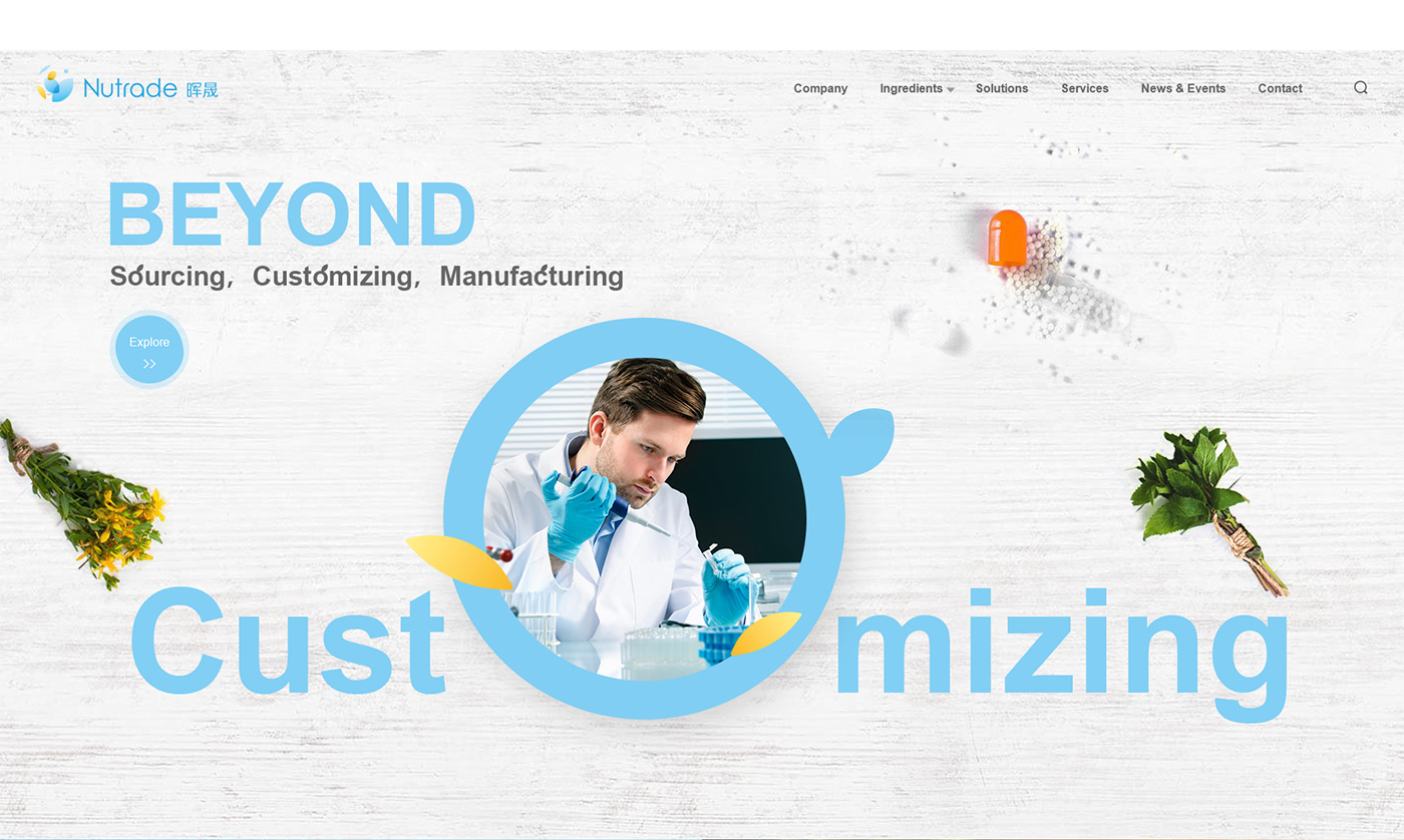 面對(duì)海外要企業(yè),網(wǎng)站首頁(yè)廣告圖以貫穿暉昇制藥從原料到成品的過(guò)程,網(wǎng)站體現(xiàn)暉昇制藥從原料的選材和成份的提煉到成型和包裝。