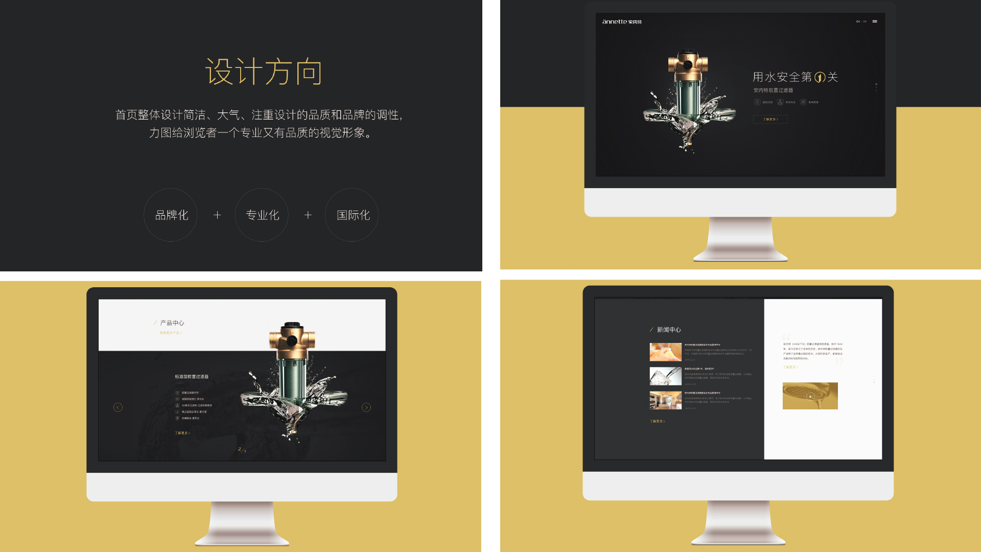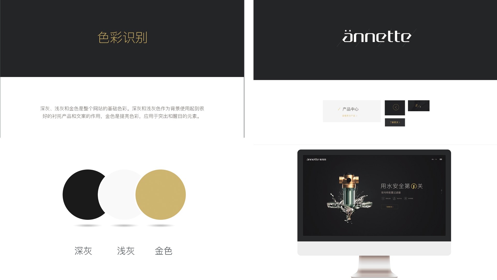深灰、淺灰和金色是整個(gè)網(wǎng)站的基礎(chǔ)色彩。深灰和淺灰色作為背景使用起到很好的襯托產(chǎn)品和文案的作用,金色是提亮色彩,應(yīng)用于突出和醒目的元素。首頁整體設(shè)計(jì)簡潔、大氣、注重設(shè)計(jì)的品質(zhì)和品牌的調(diào)性力圖給瀏覽者一個(gè)專業(yè)又有品質(zhì)的視覺形象。